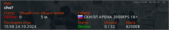 Играет на Counter Strike 1.6 сервере. Страна: РоссияПервый раз замечен 15:56 24.10.2024