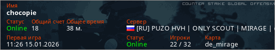 Играет на Counter Strike Global Offensive сервере. Страна: РоссияПервый раз замечен 11:26 15.01.2026