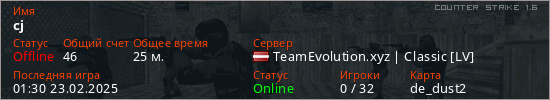 Играет на Counter Strike 1.6 сервере. Страна: ЛатвияПервый раз замечен 00:57 23.02.2025