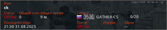 Играет на Counter Strike 1.6 сервере. Страна: РоссияПервый раз замечен 22:16 30.08.2025