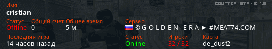 Играет на Counter Strike 1.6 сервере. Страна: РоссияПервый раз замечен 15:58 08.02.2026