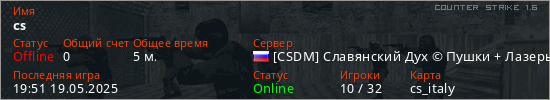 Играет на Counter Strike 1.6 сервере. Страна: РоссияПервый раз замечен 19:49 19.05.2025