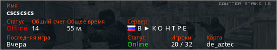 Играет на Counter Strike 1.6 сервере. Страна: РоссияПервый раз замечен 20:27 14.03.2026