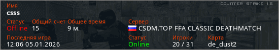 Играет на Counter Strike 1.6 сервере. Страна: РоссияПервый раз замечен 11:00 05.01.2026