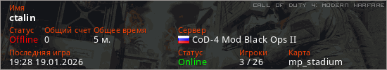 Играет на Call of Duty 4: Modern Warfare сервере. Страна: РоссияПервый раз замечен 19:24 19.01.2026