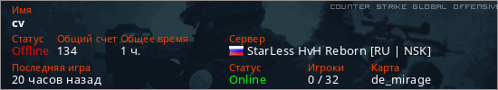 Играет на Counter Strike Global Offensive сервере. Страна: РоссияПервый раз замечен 21:51 23.01.2026