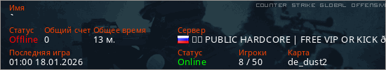 Играет на Counter Strike Global Offensive сервере. Страна: РоссияПервый раз замечен 19:47 21.07.2025