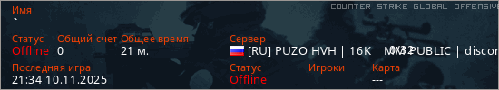 Играет на Counter Strike Global Offensive сервере. Страна: РоссияПервый раз замечен 10:54 03.06.2025