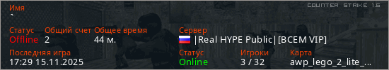 Играет на Counter Strike 1.6 сервере. Страна: РоссияПервый раз замечен 12:32 19.01.2025