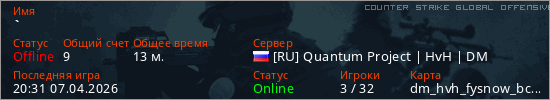 Играет на Counter Strike Global Offensive сервере. Страна: РоссияПервый раз замечен 16:13 06.04.2026