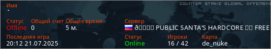 Играет на Counter Strike Global Offensive сервере. Страна: РоссияПервый раз замечен 19:47 21.07.2025