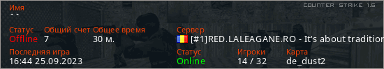 Играет на Counter Strike 1.6 сервере. Страна: РумынияПервый раз замечен 22:44 25.01.2023