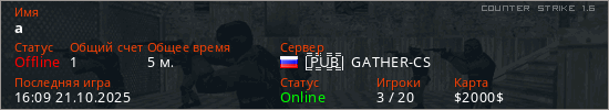 Играет на Counter Strike 1.6 сервере. Страна: РоссияПервый раз замечен 15:16 21.10.2025
