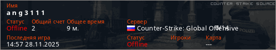 Играет на Counter Strike Source сервере. Страна: РоссияПервый раз замечен 14:24 28.11.2025