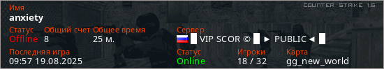 Играет на Counter Strike 1.6 сервере. Страна: РоссияПервый раз замечен 15:05 17.08.2025