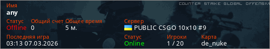 Играет на Counter Strike Global Offensive сервере. Страна: УкраинаПервый раз замечен 00:46 07.03.2026