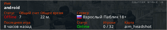 Играет на Counter Strike 1.6 сервере. Страна: РоссияПервый раз замечен 14:58 26.02.2025