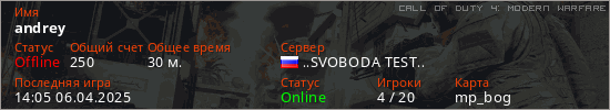 Играет на Call of Duty 4: Modern Warfare сервере. Страна: РоссияПервый раз замечен 20:26 01.03.2025