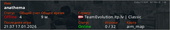 Играет на Counter Strike 1.6 сервере. Страна: ЛатвияПервый раз замечен 22:03 16.01.2026