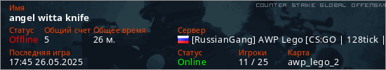 Играет на Counter Strike Global Offensive сервере. Страна: РоссияПервый раз замечен 01:55 22.05.2025