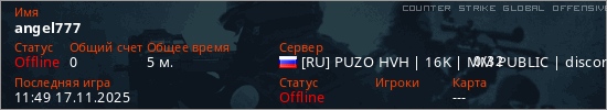 Играет на Counter Strike Global Offensive сервере. Страна: РоссияПервый раз замечен 11:47 17.11.2025