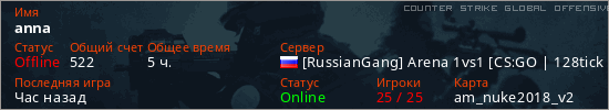 Играет на Counter Strike Global Offensive сервере. Страна: РоссияПервый раз замечен 19:16 31.12.2024