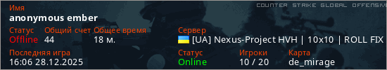 Играет на Counter Strike Global Offensive сервере. Страна: УкраинаПервый раз замечен 15:21 28.12.2025