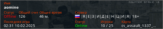 Играет на Counter Strike 1.6 сервере. Страна: РоссияПервый раз замечен 02:13 10.02.2025