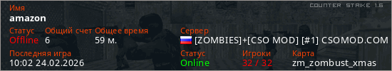 Играет на Counter Strike 1.6 сервере. Страна: РоссияПервый раз замечен 11:49 19.02.2026