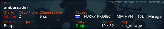 Играет на Counter Strike Global Offensive сервере. Страна: РоссияПервый раз замечен 13:36 19.03.2026
