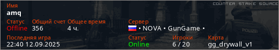 Играет на Counter Strike Source сервере. Страна: РоссияПервый раз замечен 16:55 22.04.2025
