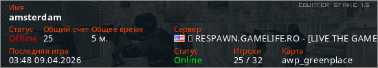 Играет на Counter Strike 1.6 сервере. Страна: СШАПервый раз замечен 03:29 09.04.2026