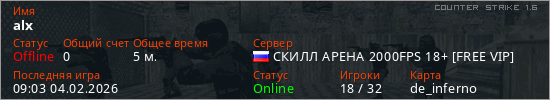 Играет на Counter Strike 1.6 сервере. Страна: РоссияПервый раз замечен 09:01 04.02.2026
