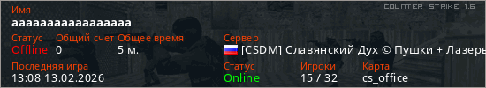 Играет на Counter Strike 1.6 сервере. Страна: РоссияПервый раз замечен 13:06 13.02.2026