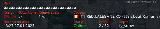 Играет на Counter Strike 1.6 сервере. Страна: РумынияПервый раз замечен 13:07 16.07.2022
