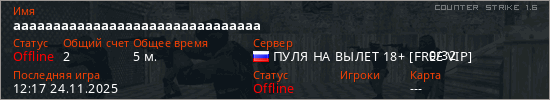 Играет на Counter Strike 1.6 сервере. Страна: РоссияПервый раз замечен 11:12 24.11.2025