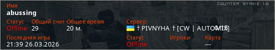 Играет на Counter Strike 1.6 сервере. Страна: УкраинаПервый раз замечен 21:14 26.03.2026