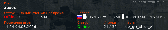 Играет на Counter Strike 1.6 сервере. Страна: РоссияПервый раз замечен 11:22 04.03.2026