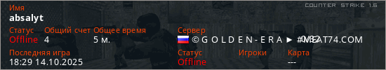 Играет на Counter Strike 1.6 сервере. Страна: РоссияПервый раз замечен 18:22 14.10.2025