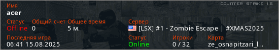 Играет на Counter Strike 1.6 сервере. Страна: СШАПервый раз замечен 06:30 15.08.2025