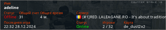 Играет на Counter Strike 1.6 сервере. Страна: РумынияПервый раз замечен 22:30 28.12.2024