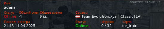 Играет на Counter Strike 1.6 сервере. Страна: ЛатвияПервый раз замечен 20:48 11.04.2025
