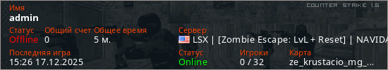 Играет на Counter Strike 1.6 сервере. Страна: СШАПервый раз замечен 15:24 17.12.2025