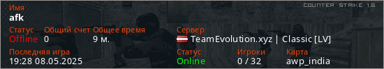 Играет на Counter Strike 1.6 сервере. Страна: ЛатвияПервый раз замечен 19:17 08.05.2025