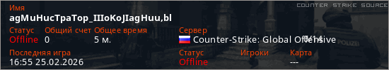 Играет на Counter Strike Source сервере. Страна: РоссияПервый раз замечен 16:32 25.02.2026