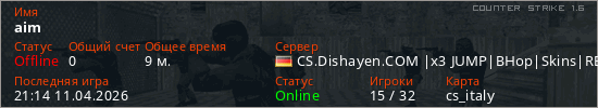 Играет на Counter Strike 1.6 сервере. Страна: ГерманияПервый раз замечен 20:55 11.04.2026
