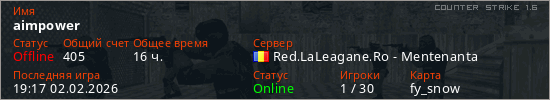 Играет на Counter Strike 1.6 сервере. Страна: РумынияПервый раз замечен 23:09 25.02.2023