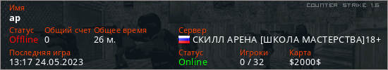 Играет на Counter Strike 1.6 сервере. Страна: РоссияПервый раз замечен 13:15 24.05.2023