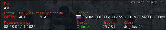 Последний раз был в сети 08:48 02.11.2025 Игрок с таким ником замечен на 7 серверах