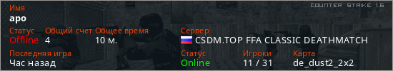 Играет на Counter Strike 1.6 сервере. Страна: РоссияПервый раз замечен 01:04 06.03.2026